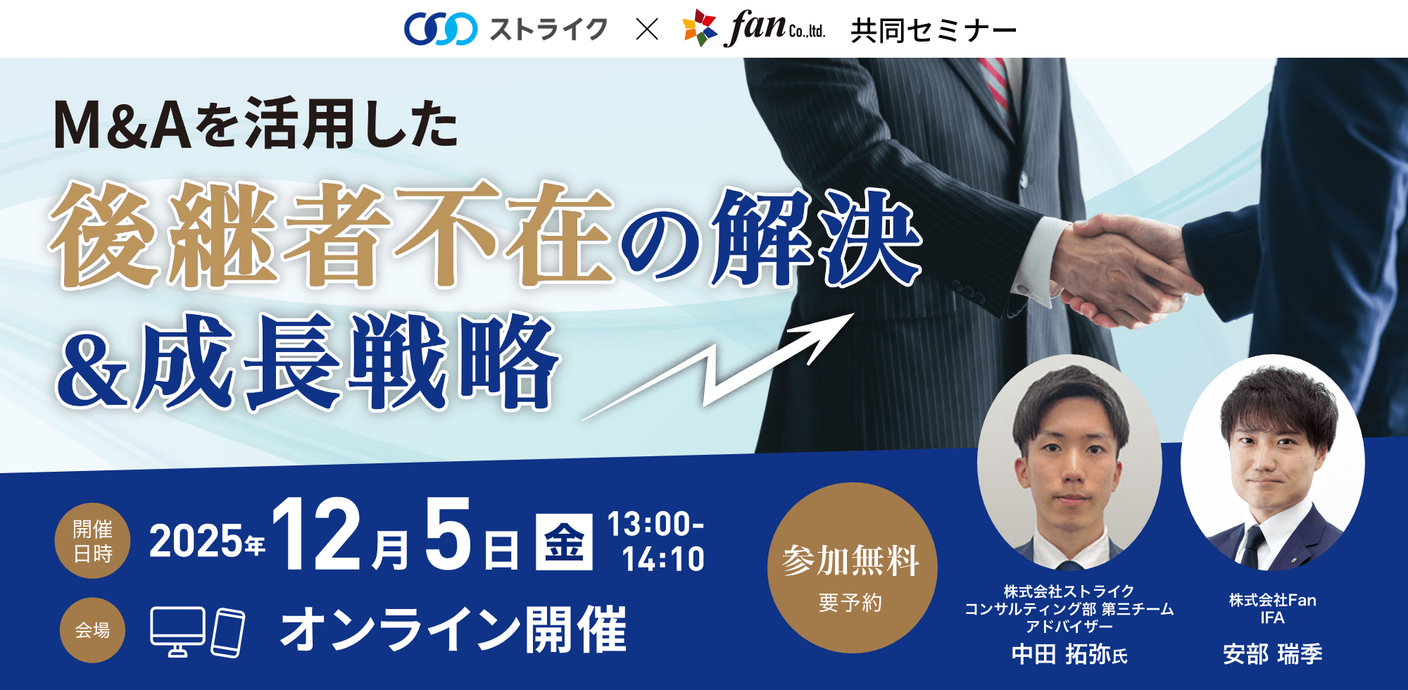 本セミナーでは、単なる廃業回避ではなく、 M&Aを「事業の未来を拓く成長戦略」として活用するための具体的なノウハウを徹底解説いたします。